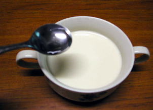 スープカップに豆乳を150cc入れます。そこへ天然にがりをティースプーンに1杯弱(4分の3くらい)を入れます。 |