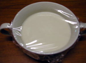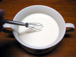 スープカップに豆乳を150cc入れます。そこへ天然にがりをティースプーンに1杯弱(4分の3くらい)を入れます。 |
